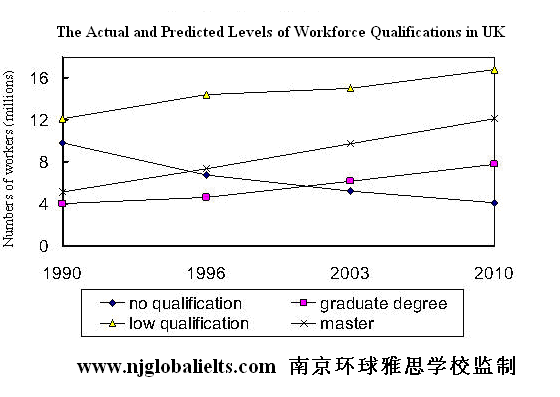 小作文是一幅线图,讲的是the levels of qualification of UK workforces(1990-2010),
